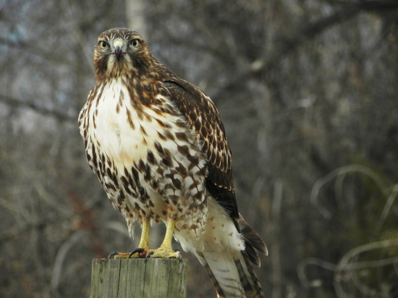 This regal hawk landed on the post right next to me when i was hiking. My little dog Jahma was under the post looking up at her. She had something to say to us!