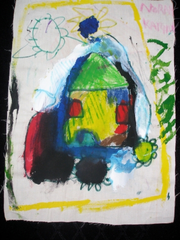 This is a painting done on muslin fabric that one of our Amani Children painted. Each piece was sewn into a wall hanging for their home in Meru, Kenya. These will be made into greeting cards soon. visit