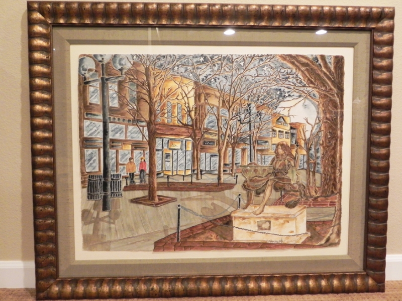 This is the original watercolor painting of 'Pearl Street.' It is done in 3D by cutting and stacking the paper. It is framed with a linen matt and the art is 'floated.' prints are also available.